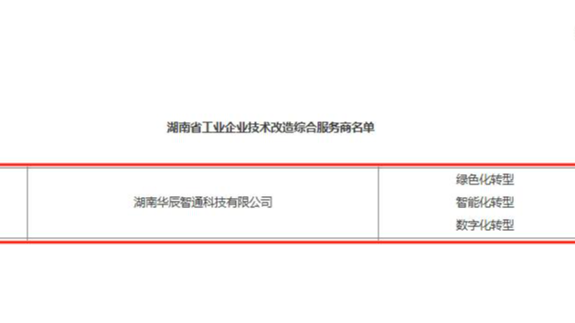 近日,湖南省工業(yè)和信息化廳正式公布湖南省工業(yè)企業(yè)技術(shù)改造綜合服務(wù)商入選名單,湖南華辰智通科技有限公司成功入選“綠色化轉(zhuǎn)型”、“智能化轉(zhuǎn)型”、“數(shù)字化轉(zhuǎn)型”三大類別服務(wù)商。